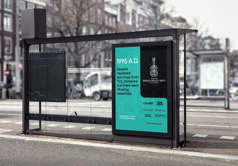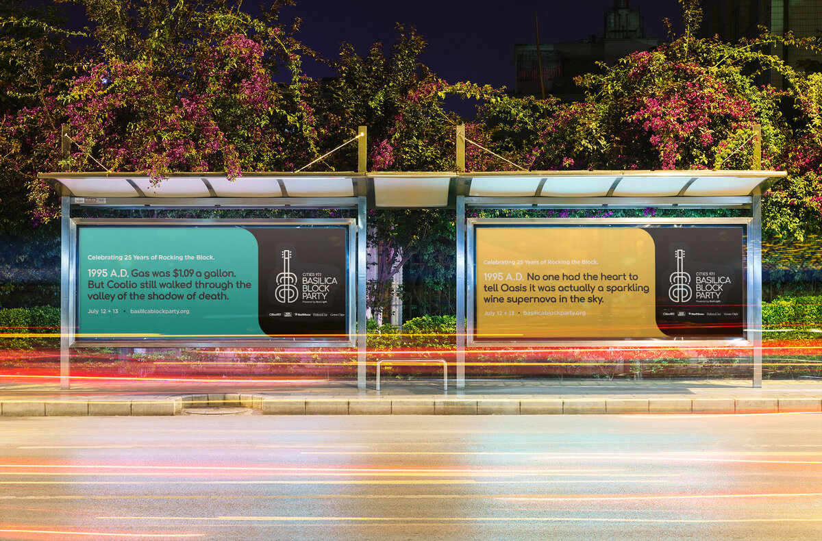 In the summer of 2019, the Basilica Block Party celebrated its 25th anniversary, and we had the opportunity to assist in the branding and advertising. Our art direction leaned into the quarter-century accomplishment by referencing what was happening in the music industry in 1995. This strategy provided us with nearly endless headlines of nostalgia and quips to parade around town.